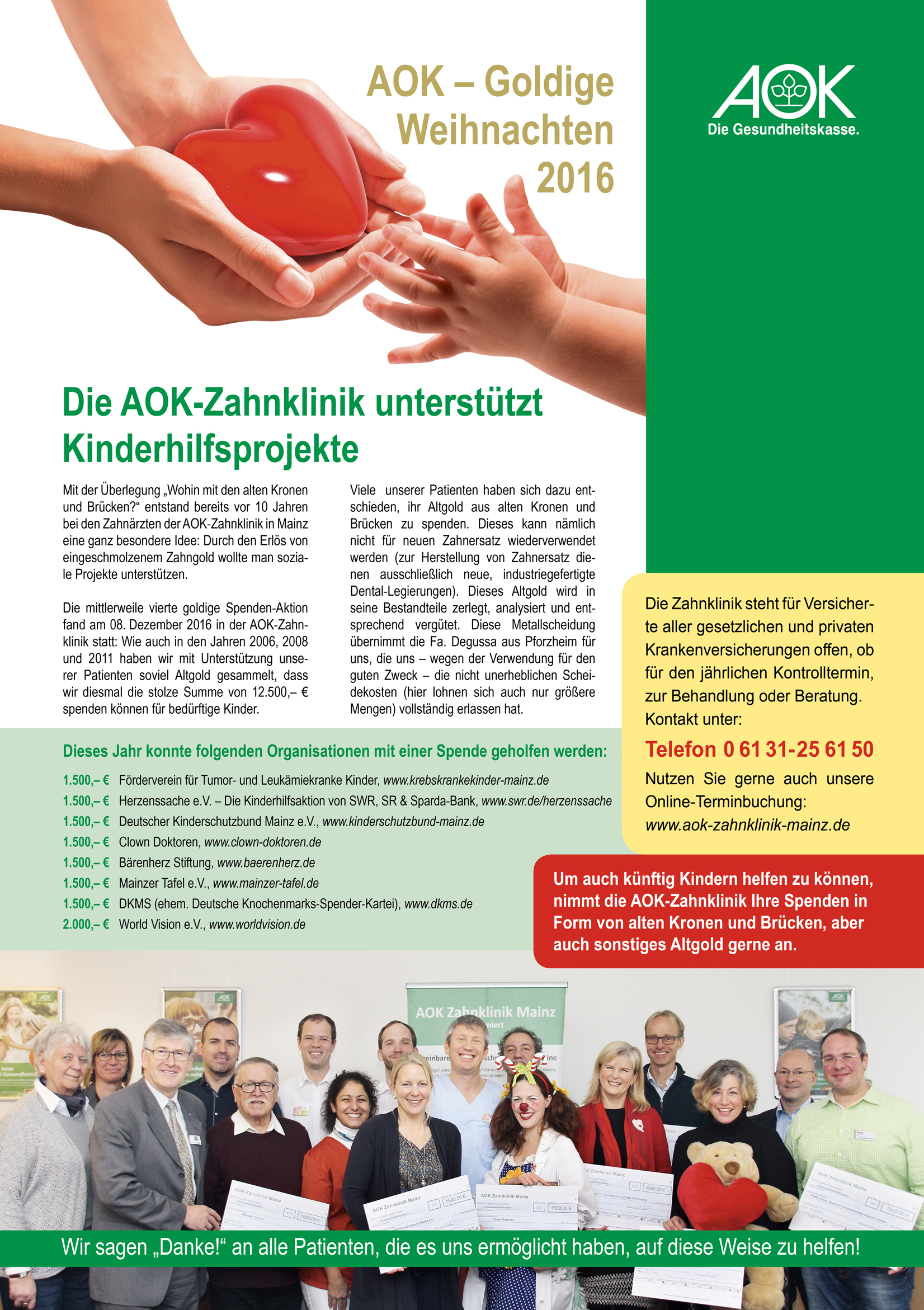 Die mittlerweile vierte goldige Spenden-Aktion fand am 08. Dezember 2016 in der AOK Zahnklinik statt: Wie auch in den Jahren 2006, 2008 und 2011 haben wir mit Unterstützung unserer Patienten soviel Altgold gesammelt, dass wir diesmal die stolze Summe von 12.500,- EURO spenden können für bedürftige Kinder. Viele unserer Patienten haben sich dazu entschieden, ihr Altgold aus alten Kronen und Brücken zu spenden. Dieses kann nämlich nicht für neuen Zahnersatz wiederverwendet werden (zur Herstellung von Zahnersatz dienen ausschließlich neue, industriegefertigte Dental-Legierungen). Dieses Altgold wird in seine Bestandteile zerlegt, analysiert und entsprechend vergütet. Diese Metallscheidung übernimmt die Firma Degussa aus Pforzheim für uns, die uns– wegen der Verwendung für den guten Zweck – die nicht unerheblichen Scheidekosten (hier lohnen sich auch nur größere Mengen) vollständig erlassen hat.